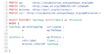 | Data can be obtained using SPARQL queries. An example to obtain all Proteins from the Lipids Community: | The WikiPathways Webservice (API) allows for automated retrieval of Pathway content (in several formats, e.g. json, XML, html, GPML). |